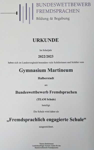 Wir gratulieren in der Kategorie SOLO Englisch: Lotta Menzel (8a), die als einzige Martineerin in dieser Kategorie einen der Landespreise in Empfang nehmen konnte. Unsere Anerkennung und unser Respekt vor dieser Leistung gelten ihr insbesondere, da sie dieselben Aufgaben wie die Mitstreiter der Klassenstufen 9 und 10 bewältigte. Als Auszeichnung wird sie als eine von 12 Nominierten am Landesseminar zur Begabtenförderung im Juni in Halle teilnehmen.